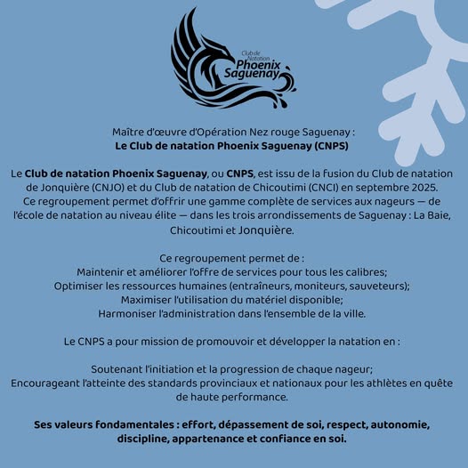 Maître d’œuvre d’Opération Nez rouge Saguenay : le Club de natation Phoenix Saguenay (CNPS) Merci au CNPS de porter notre organisation et de soutenir la mission de sécurité dans toute la région ! https://www.facebook.com/profile.php?id=61572248235242