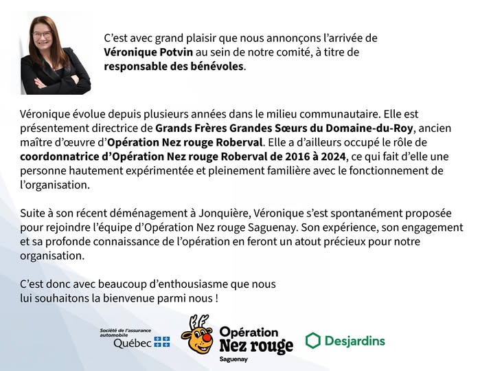 15-12-2025 Un immense merci à LE Centre Jonquière Nous tenons à remercier chaleureusement Le Centre Jonquière pour la généreuse mise à disposition de leurs locaux pour Opération Nez rouge Saguenay Votre soutien est essentiel à la réussite de notre mission : assurer des retours sécuritaires pendant la période des Fêtes et veiller à la sécurité de notre communauté Merci pour votre confiance, votre générosité et votre engagement envers la collectivité